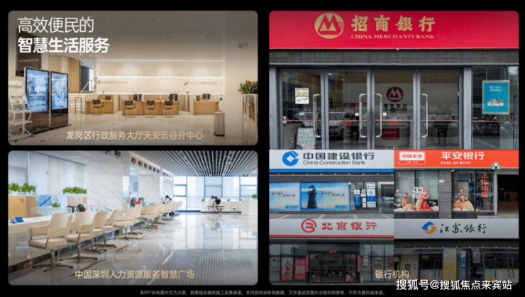 便民政务:园区内设龙岗区行政服务大厅天安云谷分中心、深圳人力资源服务智慧广场,入驻了招商银行、平安银行、建设银行等十几家银行机构,可直接办理社保业务、公积金业务、理财对公等政务商务需求。