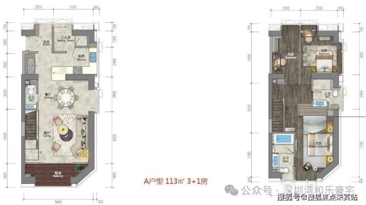 113㎡户型是深圳湾公馆的中高端产品,实际使用面积达148㎡,采用南北通透三面景观设计,5.6米客厅与主卧开间。该户型最大的特点是增设了工人房,实现了更为彻底的"主佣分离",适合有佣人同住需求的高净值家庭。从空间布局看,下层为5.6米横厅、餐厅、厨房及佣人房,上层为三间卧室(含两个套房)及家庭厅,功能分区明确而高效。
