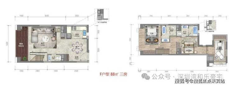 87-88㎡户型是深圳湾公馆的主力产品,提供二房和三房两种配置,实际使用面积126-134㎡。该系列户型采用南北通透设计,5.4米大开间,复式下层整合了餐厨客厅并连接宽景阳台,上层为私密卧房全明采光。部分双套房设计的88㎡户型尤其受到改善型买家的青睐,其"室内多变空间可根据家庭需要设置独特功能",展现了复式住宅的灵活优势。