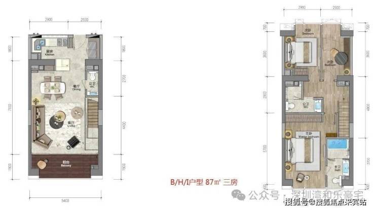 79㎡户型作为深圳湾公馆的入门级产品,却通过精妙的复式设计实现了"小面积、大空间"的居住体验。该户型实际使用面积高达129㎡,得房率约85%-88%,是项目中最具性价比的选择之一。从空间布局来看,下层为公共活动区,包含5.4米大开间的客厅、餐厅和厨房,连接宽景阳台;上层为私密休息区,设置三间卧室,其中主卧为豪华套房设计,配备阳光主卫和独立衣帽间,次卧还设有约10㎡的多功能衣帽间。