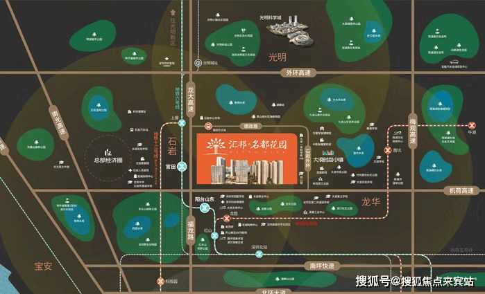 深港中轴,榜样湾区 ;深圳西进门户宝安“ 三带两心一谷 ”战略实施, 石岩市政、交通、文旅、教育等十大产业投建。项目地处宝安、龙华、光明黄金三角交汇带,区域形成“两轴五区”产业格局;汇邦名都花园坐落于深圳中轴发展带上,中部组团发展中心,临近龙大高速及福龙路,通过福龙路可便捷对接市中心区。