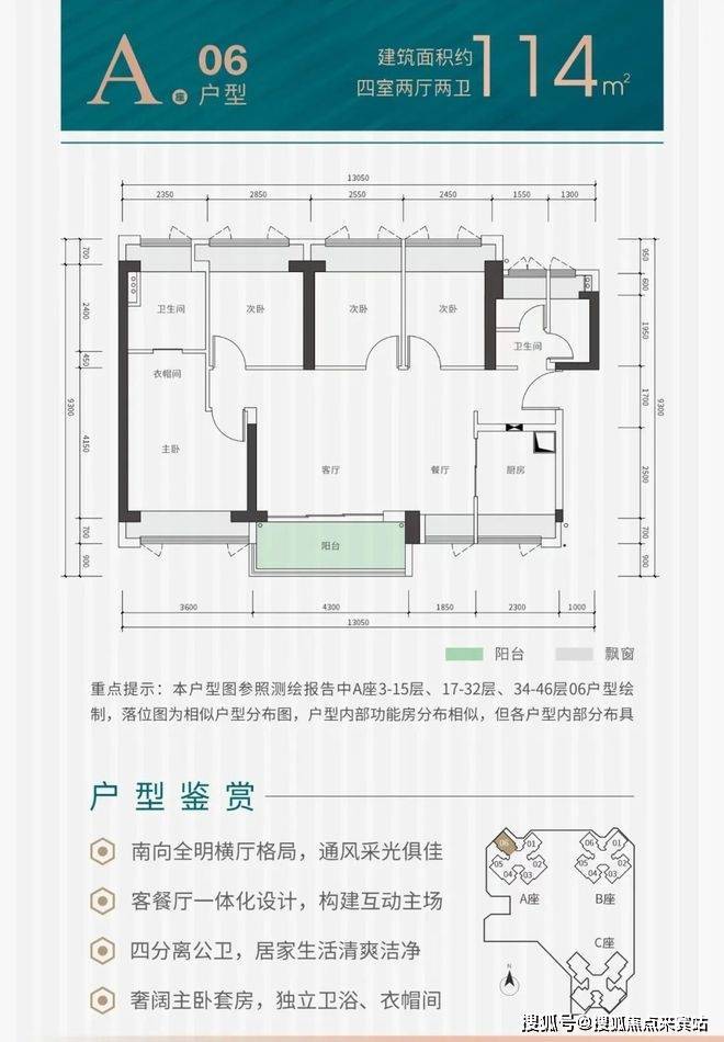 114㎡的4房2厅2卫,设计的是横厅南北通透格局,进门入户玄关,客餐厅实测6米开间,LDKB一体化设计,4个卧室分别做到了主卧15.25㎡/次卧9㎡/次卧8.1㎡/次卧7.9㎡(实测面积,去掉墙体),U型厨房,公卫三段式分离,得房率约76.2%(不含赠送),阳台主朝西南或东南向。套内面积86.92㎡+实测赠送面积14.31㎡,加上赠送得房率88.77%。
