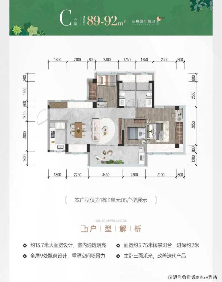 前海会展首发建面约78-117㎡三四房新规作品,户型拓展后实际使用率最高可达105%;主、次卧270°转角双飘窗(建面约117m次卧除外);建面约9-13㎡新规宽景阳台重构居住想象