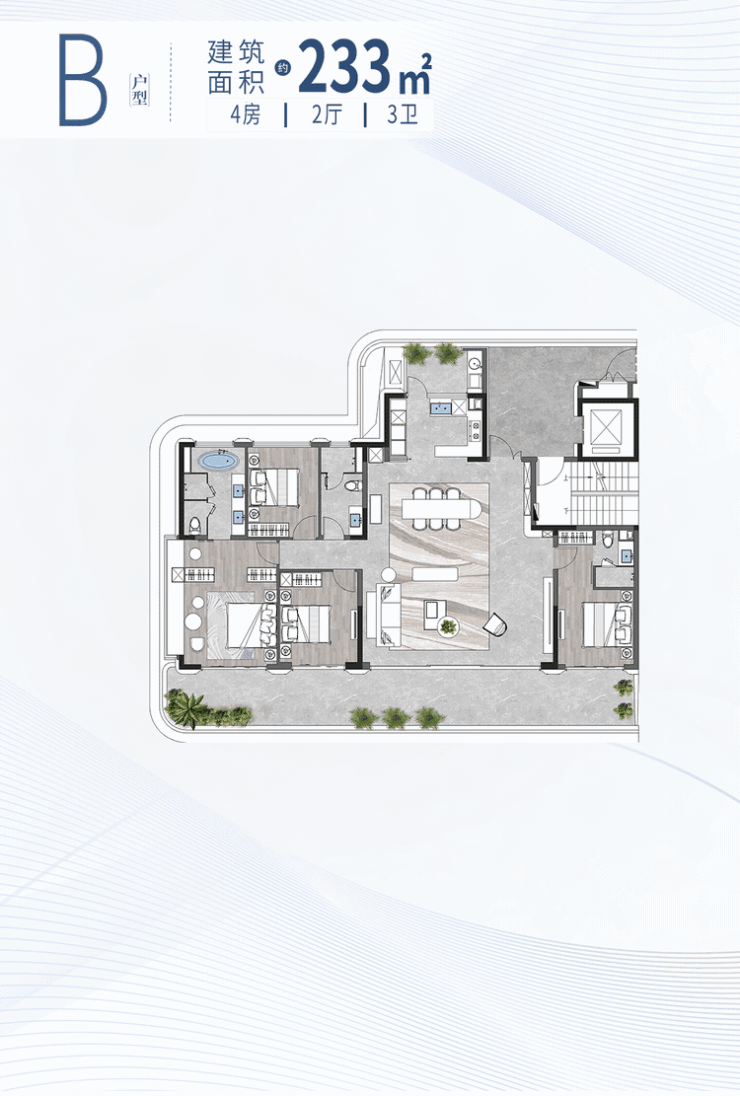 全系一梯一户,其270°全景端厅,将“客厅+餐厅+厨房+阳台”形成一个LDKB连贯空间,通透无柱,环幕式视野无限开阔,打造家族社交门面。