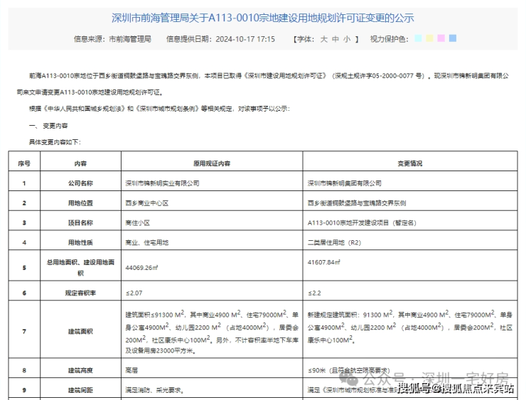 地块属性变更:2024年10月,深圳市前海管理局对该地块建设用地规划许可证进行变更,用地性质由原来的"商业+住宅"混合用地调整为纯二类居住用地,容积率由2.07提升至2.2,总建筑面积增加至约9.13万㎡。