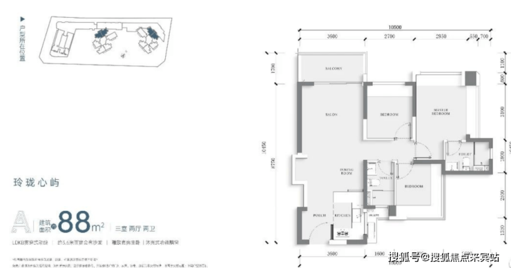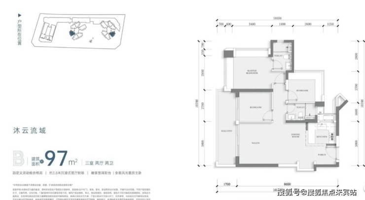 +【97㎡3房2厅2卫】:对比88㎡户型,就是空间更大了,居住的舒适度会更大。客厅开间3.8米,另外还有一个6.5米长的双阳台。