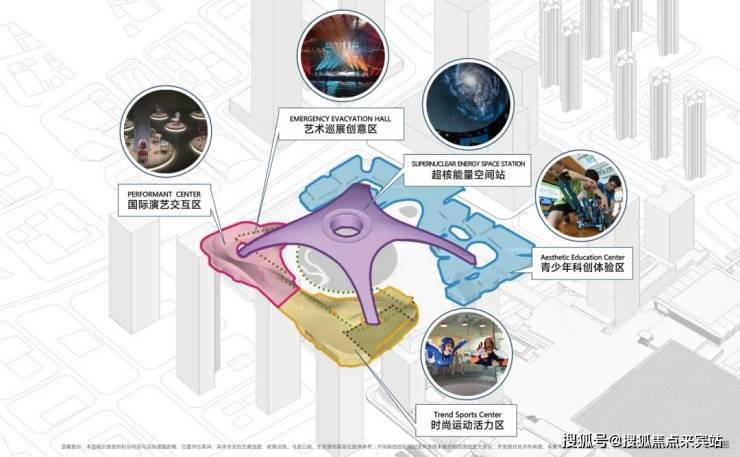 ◎青少年科创体验区 ◎国际演艺交互区 ◎艺术巡展创意区 ◎时尚运动活力区