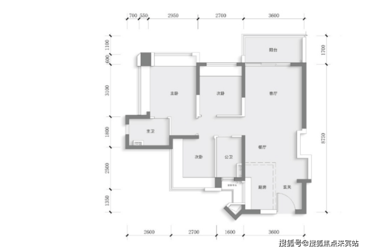 这个户型最大的亮点就是客厅开间做到了3.6米,主卧开间做到了3.5米,并且还是L型双飘窗,一般只有90平以上的户型才会把开间做到这么大
