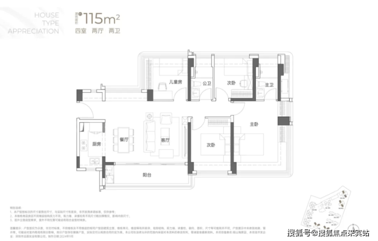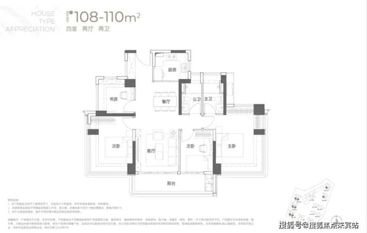 108-110㎡4房2卫户型:为西南向或东南向,竖庭设计,南北通透,阳台也是连通到次卧对出,比较宽敞。