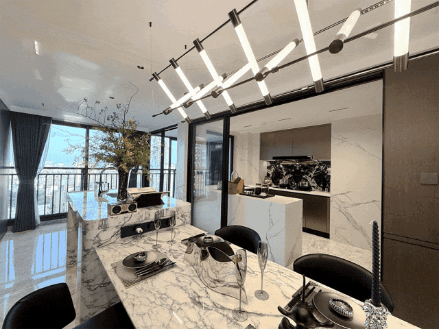 餐厅中岛台设计将中西厨分离,设置双动线,日常行动更为流畅自然。大理石西厨台触手生温的质感与自然流畅的纹理,赋予就餐空间更多温度与考究品质。贴墙打造酒柜、餐边柜,集收纳、展示功能于一体,既是对餐厨收纳的补充,也为空间注入摩登风尚。