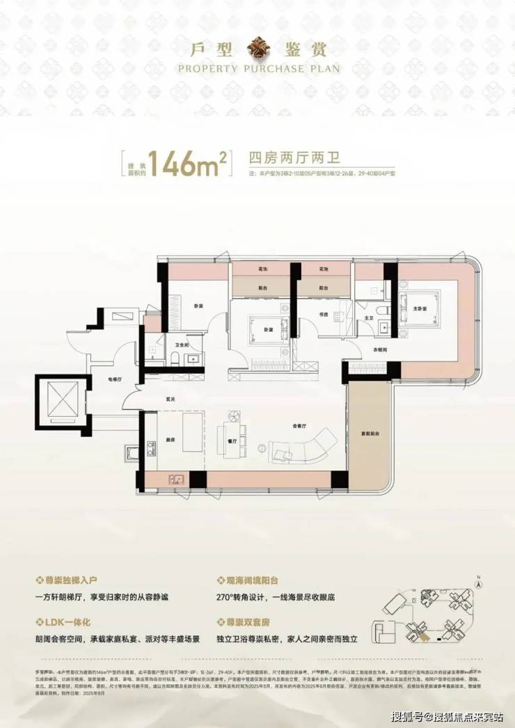 146㎡的4房2厅2卫,设计的是竖厅格局,尊享独立电梯入户,LDKB一体化设计,动静分区,主卧270°无柱转角全景舱,L型厨房+岛台设计,卫生间干湿分离,得房率约105%(包含赠送),东南朝向看海景景观。