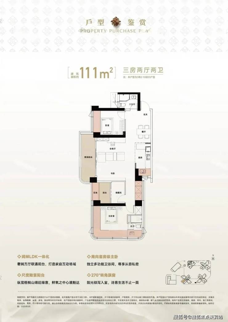 111㎡的3房2厅2卫,设计的是竖厅格局,LDK一体化设计,四开间朝南,主卧270°无柱转角全景舱,L型厨房,卫生间干湿分离,得房率约94%(包含赠送),西北朝向看一线梧桐山景观。