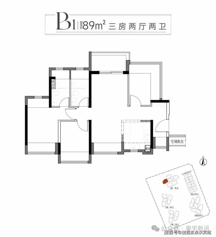 一:建面约89平方A1户型三房两厅两卫