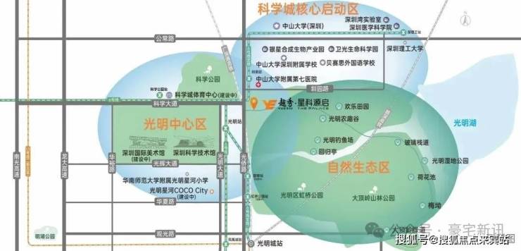 越秀星科源启,位于光明区新湖街道光侨路与科学大道交汇处东南侧,地处光明中心区板块,西北侧与科学公园北翼相邻,东南侧则是充满欢乐的光明欢乐田园,北侧靠近中山大学深圳校区及其附属第七医院,南面距离光明高铁站仅4.8公里。
