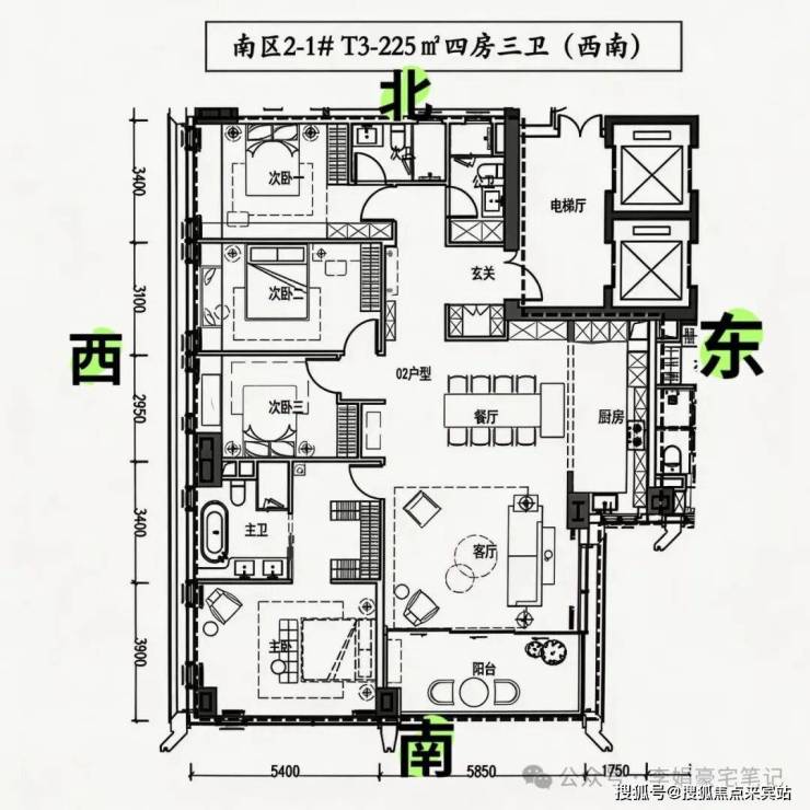 2.约225㎡四房三卫:位于楼栋西南,主阳台正南看园林,侧东南看公园。四房双套设计,卧室朝西,采光充足。