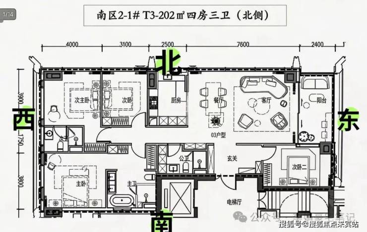 约202㎡四房三卫:位于楼栋北向,三面采光,四房双套设计。主阳台朝东,大面朝北,格局方正