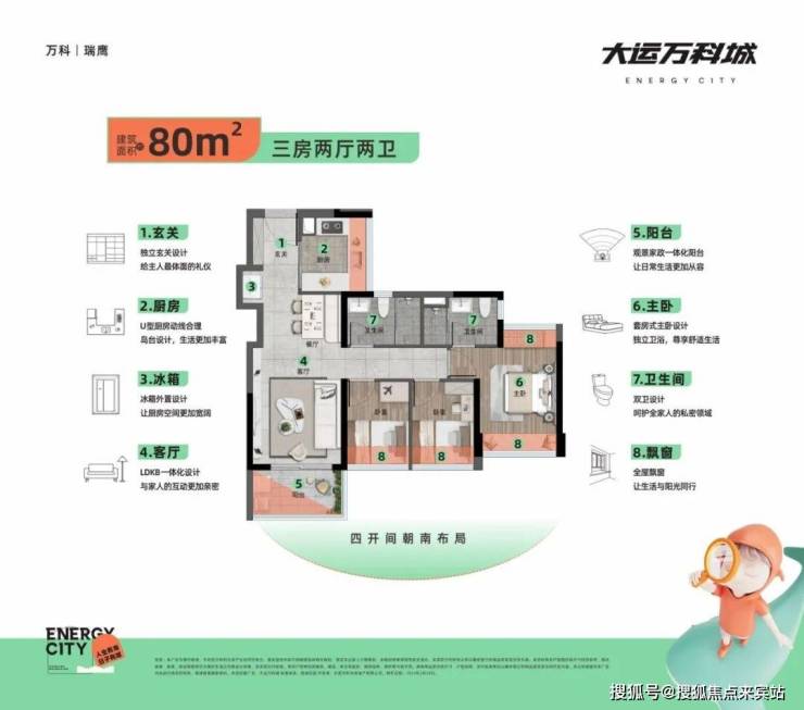 80平三房两卫,市面上最高的约94-98%可使用率,可以与其他89-95的户型套内面积媲美,10.85-12.9米的南向面宽,户型方正实用。
