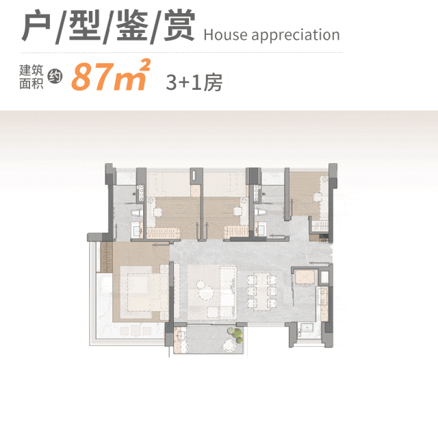 建面约87㎡3+1房,南北通透,横厅设计,格局方正。