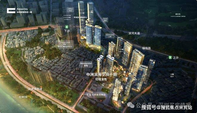 中洲湾是上沙村旧改,分四期建设,总占地约9.7万平,总建面约126万平,集海景住宅、服务式公寓、写字楼、酒店、集中式商业和商业街等多元业态为一体,是福田少有的百万级大盘。项目临近地铁7、9号线以及规划中的22号线,距离7号线上沙站约600米,距离9号线下沙站约800米,可快速到达福田口岸和皇岗口岸,广深港高铁福田站。小学和中学都是红岭实验学校(原上沙中小学),距离比较近。项目自带约16万平大型商业,包含刚刚开业的一期8万平高端Shopping Mall、二期8万平创意商业街区,与KKONE联合形成约26万平的超级城央商业圈,相当于1.5个欢乐海岸的商业体量。