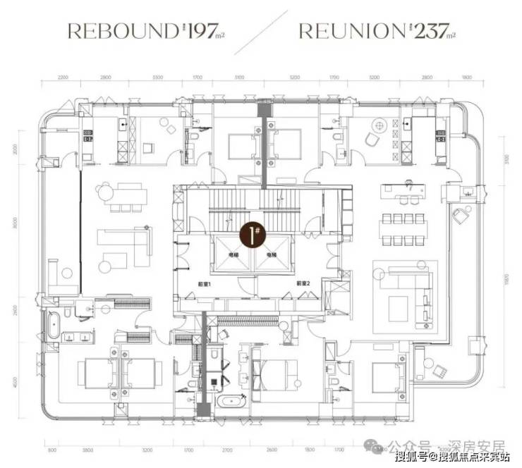 「后海招商玺」此次首推1栋小高层住宅,2T2户,专梯入户,户型为建面约197-237㎡的四房大平层。