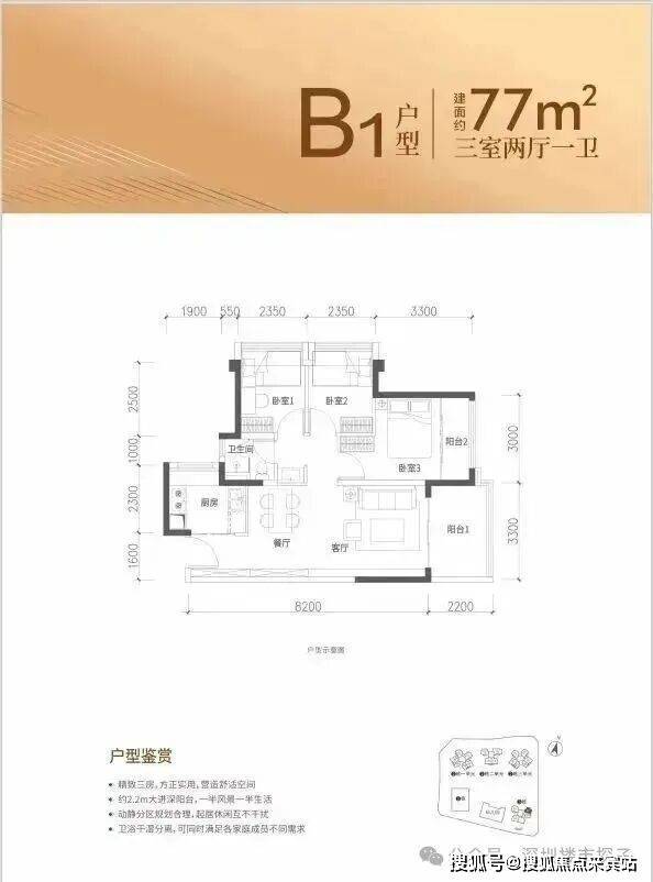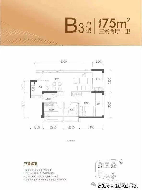 • 75-77㎡ 3房2厅1卫|刚需大三房,东南朝向看园林,小面积实现3房梦想。