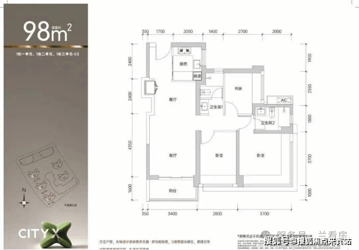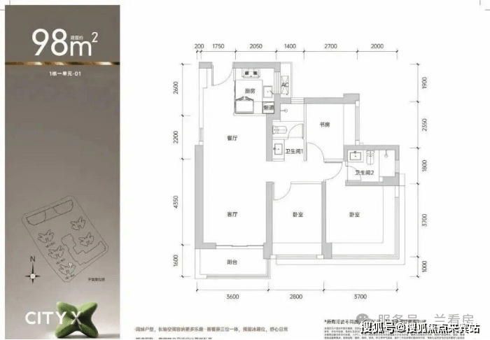 98㎡的3房2厅2卫 ,1栋1单元01户型,设计的是经典竖厅格局,进门入户玄关,客厅3.6米开间,LDKB一体化设计,动静分区,3个卧室分别做到了主卧14.3㎡/次卧10.36㎡/次卧6.75㎡(包含墙体飘窗),U型厨房,公卫三段式分离, 得房率约75.4%(不含赠送) ,东北朝向。 套内面积73.89㎡+赠送面积10.05㎡=实得83.94㎡,加上赠送后得房率约85.65%。还未推售