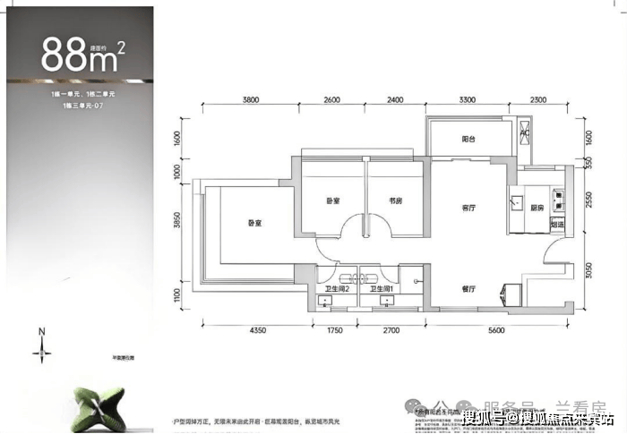88㎡的3房2厅2卫 ,设计的是竖厅南北通透格局,客厅3.3米开间,LDKB一体化设计,四开间朝南,主卧270°无转角飘窗,3个卧室分别做到了主卧15.63㎡/次卧7.54㎡/次卧6.96㎡(包含墙体飘窗),U型厨房,卫生间干湿分离, 得房率约74.6-75.4%(不含赠送) ,阳台主朝西北或东北向。 套内面积66.45㎡+赠送面积11.58㎡=实得78.03㎡,加上赠送后得房率约87.56%。