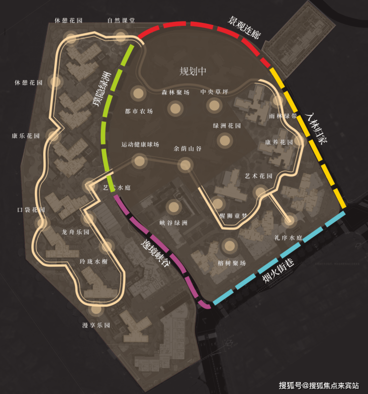 •横一路归家大道+环一路森境谧道+中央花谷逸境+峡谷商业内街