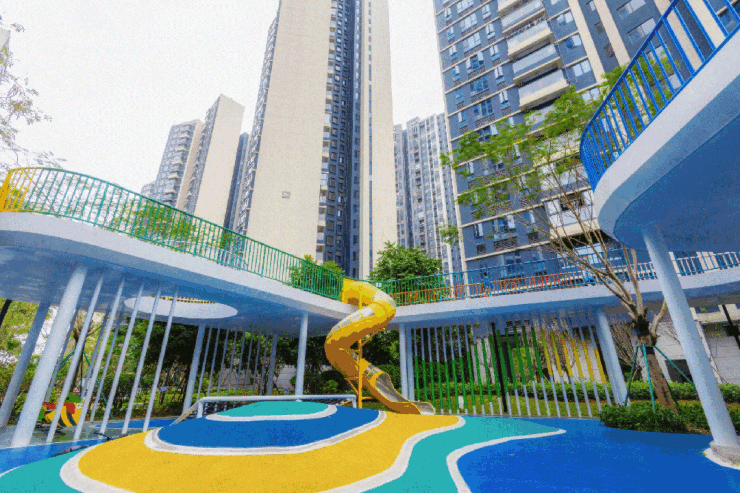 在目之所及的绿意里,还有童梦森林乐园、露天草坪、儿童滑梯、休闲会客厅、健康跑道等,孩童玩耍、大人健身、长辈散步,覆盖全龄段休闲需求。