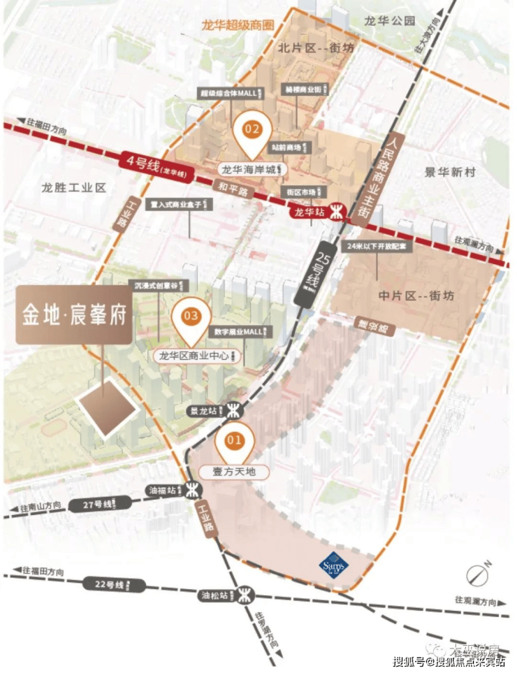 交通方面:位于龙华多条地铁线交汇处,地铁 4 号线龙华站及 6 号线上芬站举步即达,规划中地铁22、25、27号线等站点(规划中景龙站/油福站约400米)就近而设,加上规划中的侨城东路北延线和沙河东路北延线贯通龙华、南山、福田,直抵深圳湾,未来立体交通路网接驳,无界一城繁华生活。
