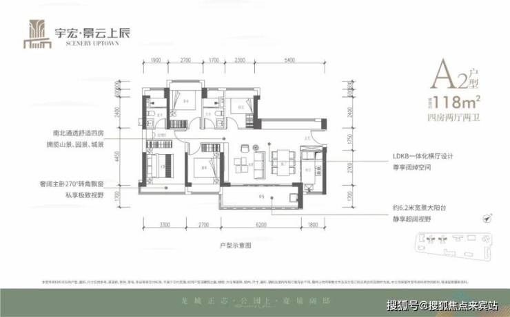 118㎡的4房2厅2卫,设计的是横厅南北通透格局,客餐厅6.2米开间,LDKB一体化,五开间朝南,西北面5.4米长的观景大飘窗,4个卧室分别做到了3.3米/2.7米/2.7米/2.3米的宽度,客厅连接餐厅位出6.2米长的大阳台,L型厨房,卫生间干湿分离,得房率约76%(不含赠送),东南朝向。
