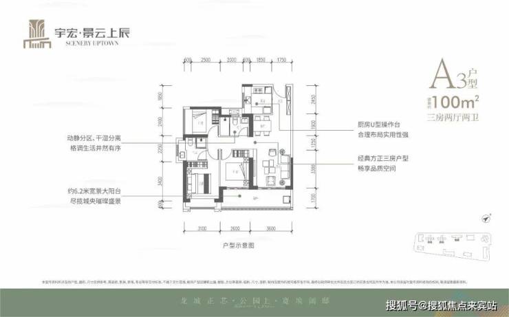 100㎡的3房2厅2卫,设计的是竖厅格局,客厅3.6米开间,LDKB一体化,三开间朝南,3个卧室分别做到了3.1米/2.6米/2.4米的宽度,客厅连接次卧出6.2米长的大阳台,U型厨房,卫生间干湿分离,得房率约76%(不含赠送),东南朝向。