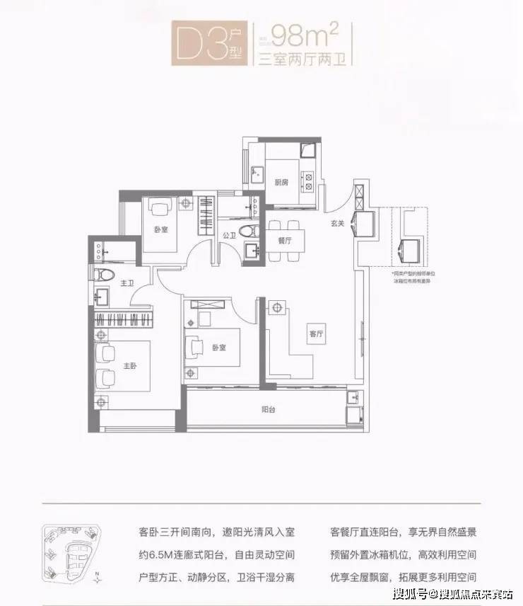 D1户型-98㎡的3房2厅2卫,设计的是竖厅格局,客厅连接次卧出阳台(有6.5米长),三开间朝南,S墙设计预留冰箱位,U型厨房,有西南、东北朝向。