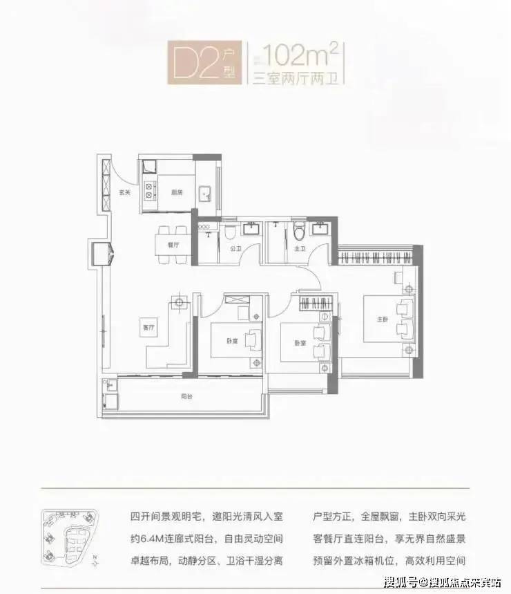 D2户型-102㎡的3房2厅2卫,设计的是竖厅格局,客厅连接卧室出阳台(有6.4米长),四开间朝南,S墙设计预留冰箱位,主卧双飘窗南北对流,U型厨房,有东北,西南朝向。