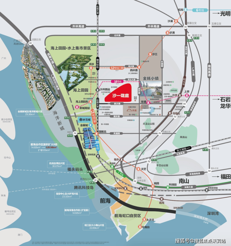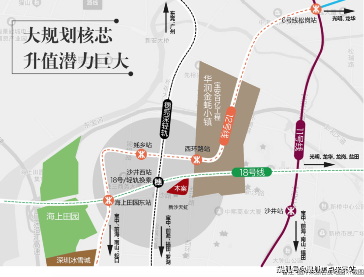 项目距离轻轨站沙井西站约200米,距地铁11号线沙井站直线距离3km(已通车),距地铁12号线西环路站800m(在建中),对外链接东莞、广州、深圳多城市城际快线,未来随着粤港澳大湾区建设,将擎动珠三角百万商务办公人群,对内直达深圳核心枢纽,1站通达机场,与1号线、11号线、20号线、12号线、18号线多轨道交汇,未来还将在前海设站,全线开通后,6站可到达前海,尽享前海高端商务人流。