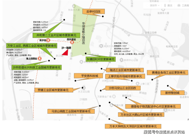 区域内超过29个旧改项目,约400万㎡城市更新,超千亿投资,众多品牌进驻。本项目毗邻华润百万级旧改——金蚝小镇,该项目规划用地范围约3平方公里,相当于3个沙井海岸城体量,4个南山华润城体量,将打造粤港澳大湾区的海洋文化地标,成为深圳西部城市中心。