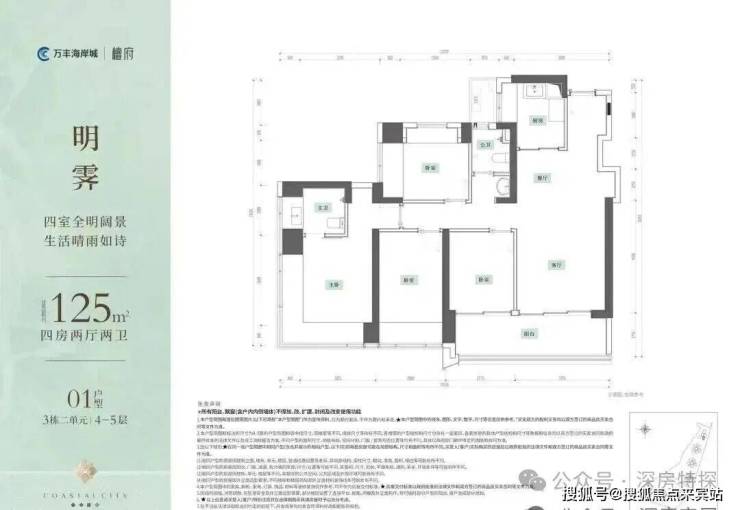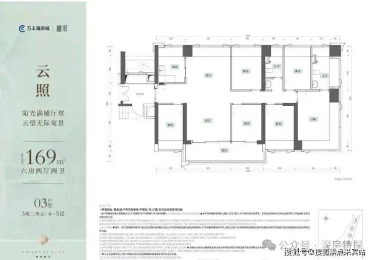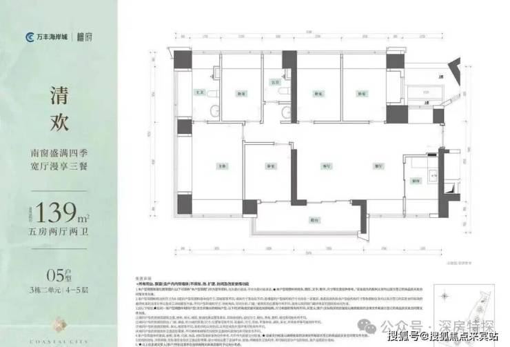 超16米东南采光面,阳台超7米宽;主卧进深4.5米,L型飘窗可270度景观。