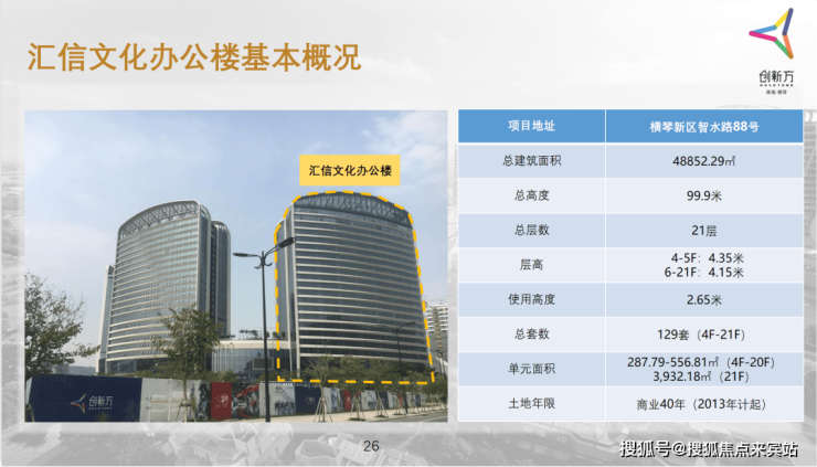汇信文化辦公樓樓高約100米,總層數21層,總建面約4.9萬㎡,總套數129套。其中在售樓層4F-20F單元面積段約為287-556㎡,21F複式產品面積約3932㎡。