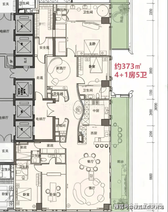 · 高区42F起(150-200米)是约370-375-403㎡4+1房五卫+家庭厅+家政套间;