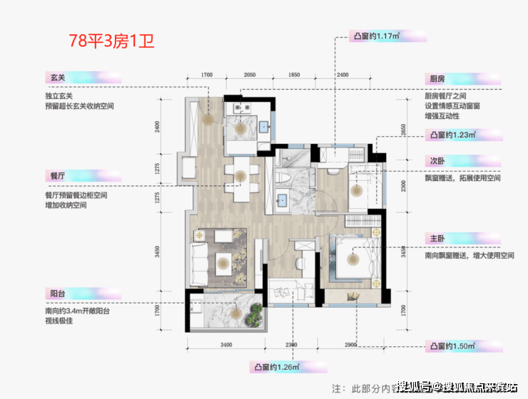 78平3房1卫,95平3房2卫,112平4房两卫三个户型