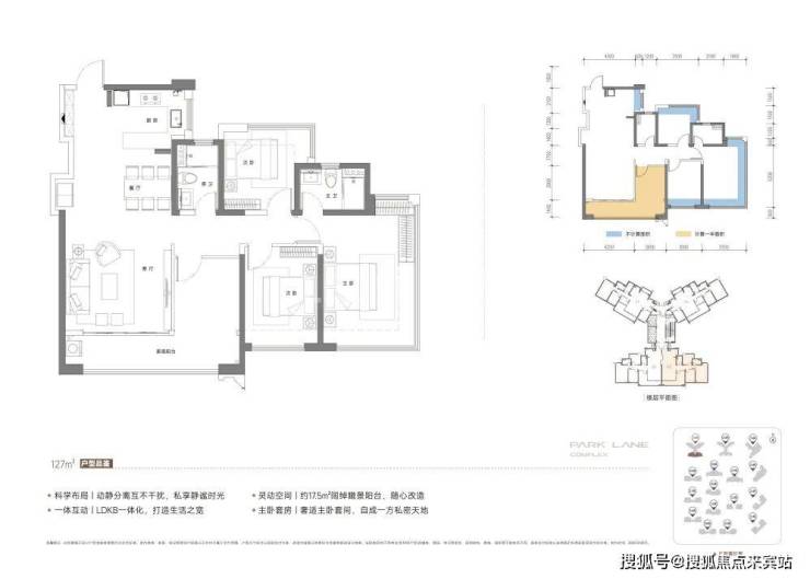 建面约 128㎡ 四房两厅两卫:项目入门级改善户型,LDKB 一体化布局,主卧配备 270° 全景飘窗,最小卧室面积超 10㎡,实得空间堪比市面 140㎡户型,适配三口之家全周期居住需求。