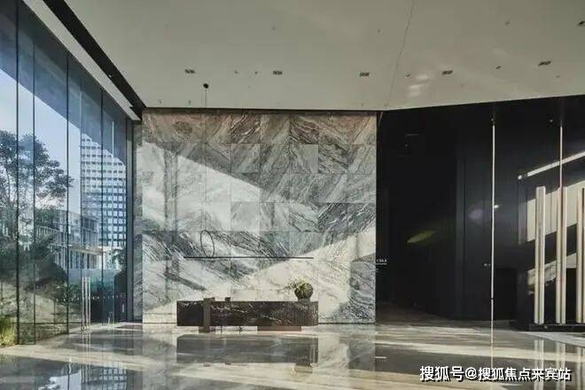 大堂及接待中心,将建筑带入艺术创造的纯粹境界,选用古奇黑石材为接待台,配以大面积的石材上墙,于10.2米的极致挑高中,将线条与空间相融,融合湾海意境,使其层次分明兼具连续性且更有韵律感,在城市肌理脱颖而出,提升整体的空间质量。