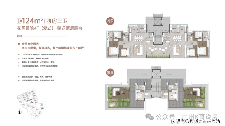这是最接近墅级形态的户型,下层做了侧花园设计,顶层的天面露台全赠送,实现了约242%的使用率。