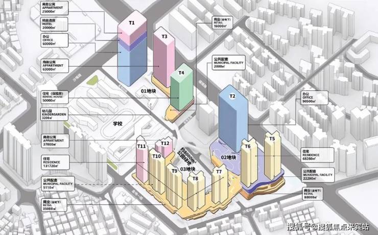 项目占地面积约2.18万㎡,规划总建面面积约32.3万㎡,由5座超高层+1座小高层建筑,外加一个下沉休闲广场及环广场裙房商业组成。