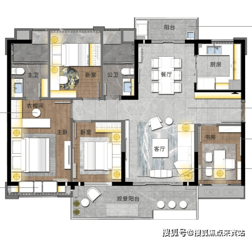 明星户型:建面约110㎡ (3+1房2厅2卫),超6米阔景阳台,朝南大横厅设计