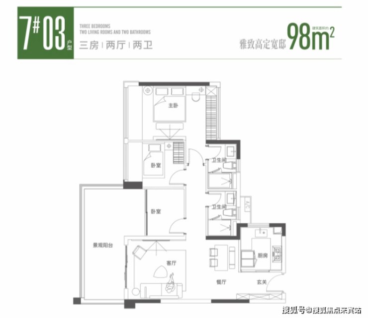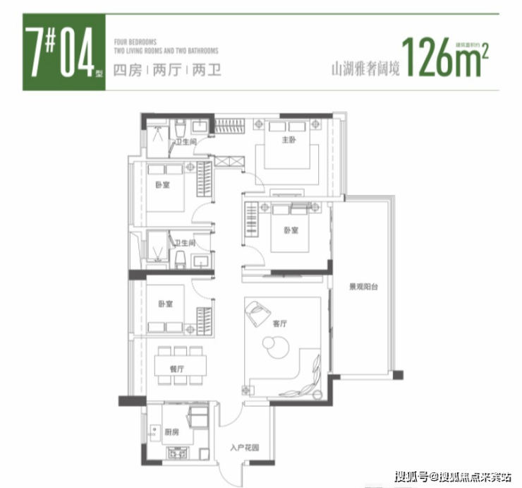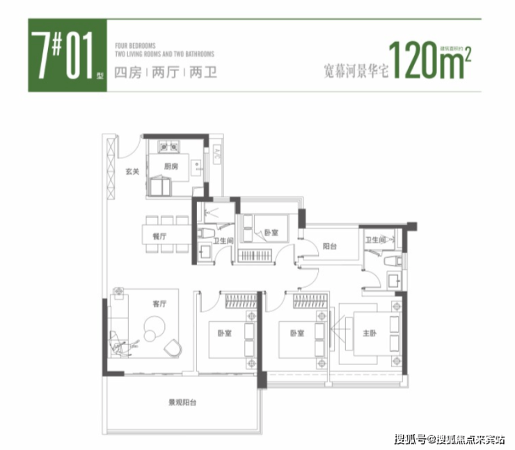 产品方面,主打 98-140㎡精装三至四房,采用新规设计,实得率接近 100%,空间利用率远超传统户型,且户户朝南,搭配大面宽景观阳台,采光通风俱佳。