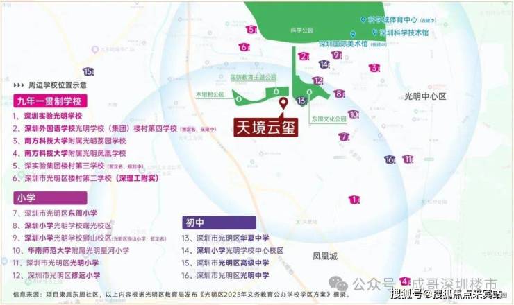 初中:深圳小学光明学校中心校区、深圳市光明区高级中学、深圳市光明区光明中学。