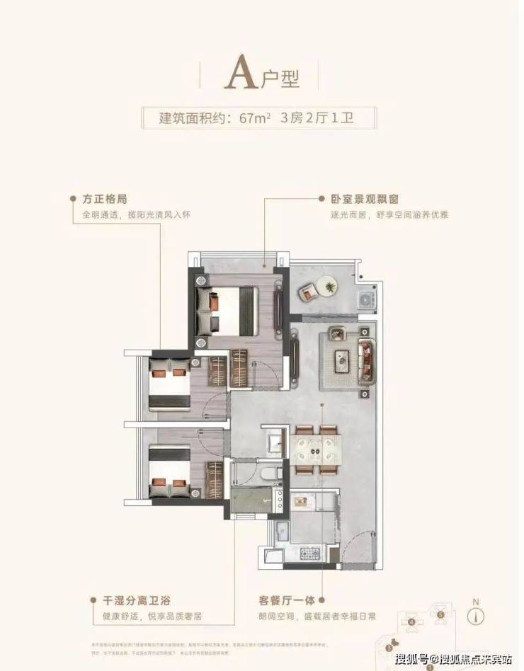 87㎡3+1房货量差不多是67㎡户型的三倍,可选择的朝向非常多,是看园景还是看城市景观。像3栋的07、08的高楼层户型既是东南朝向,同时也远离高速,也可以看一部分园景。