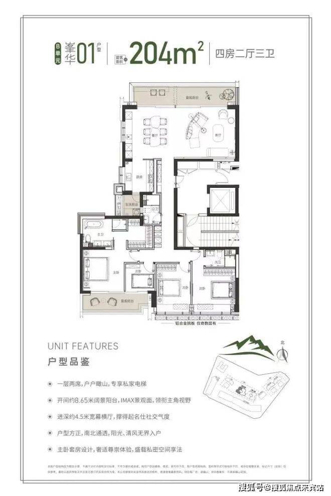 同样的专梯入户,豪宅感扑面而来,该户型为顶级大户型,四阳台设计,最大有10.55米的景观阳台和180度视野的餐客厅空间奢阔气场尽显,罕见的南北瞰景四阳台设计,让家的每个角落都能欣赏美丽的山景和城市景观。所有的开窗面都尽可能放大,客餐厅、书房、卧室、几乎都能享受超宽超大屏