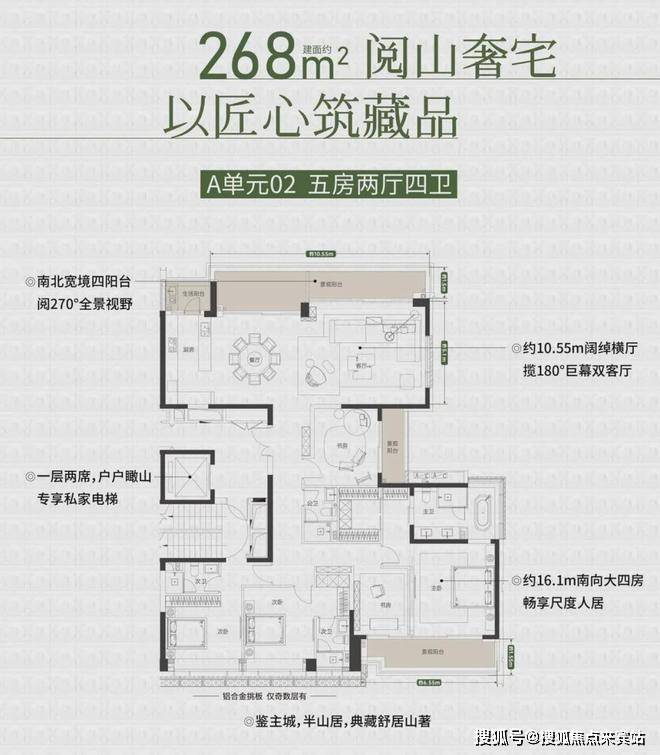 建面约268㎡的大平层户型,为五房四卫三套间设计,动静分区,将生活与居住空间相对分隔。